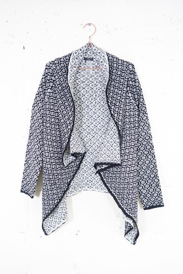 Running around town in this open geometric patterened sweater all fall. Thick enough for a chilly evening or layer it up with a long coat. Hem lies longer in front and falls to the waist line at the back.