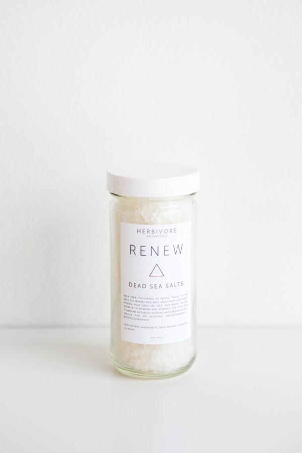 + Renew Bath Salts: An uplifting and aromatic blend of essential oils, including clary sage and rose geranium, Hiwa Kai black lava salt, and dead sea salts.