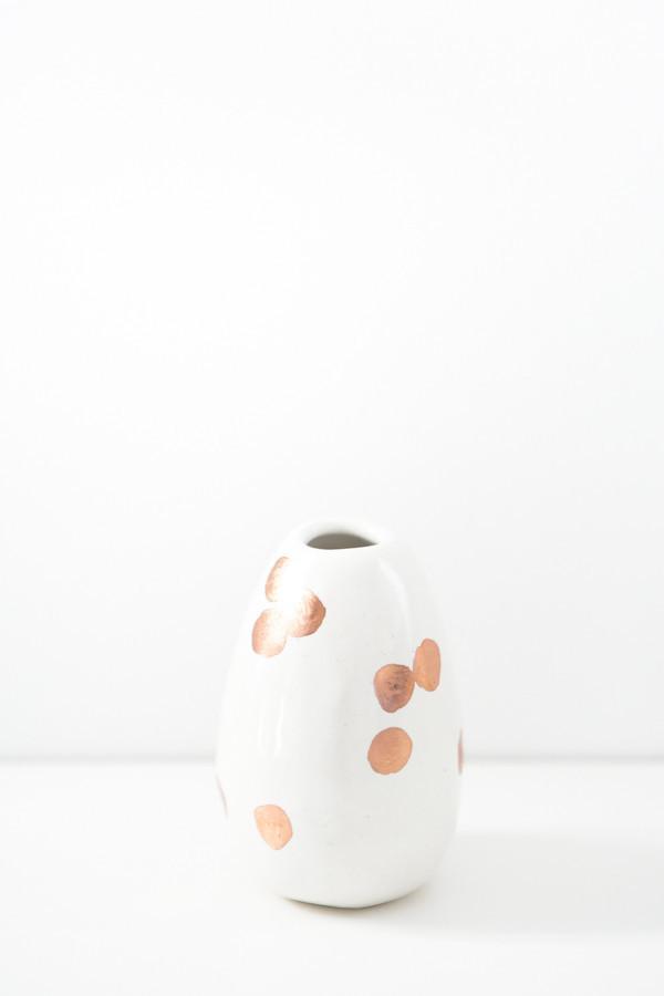 Teardrop shaped vase finished in a glossy white fire glaze and copper leaf polka dots. A stunning vase for a bouquet of fresh flowers.