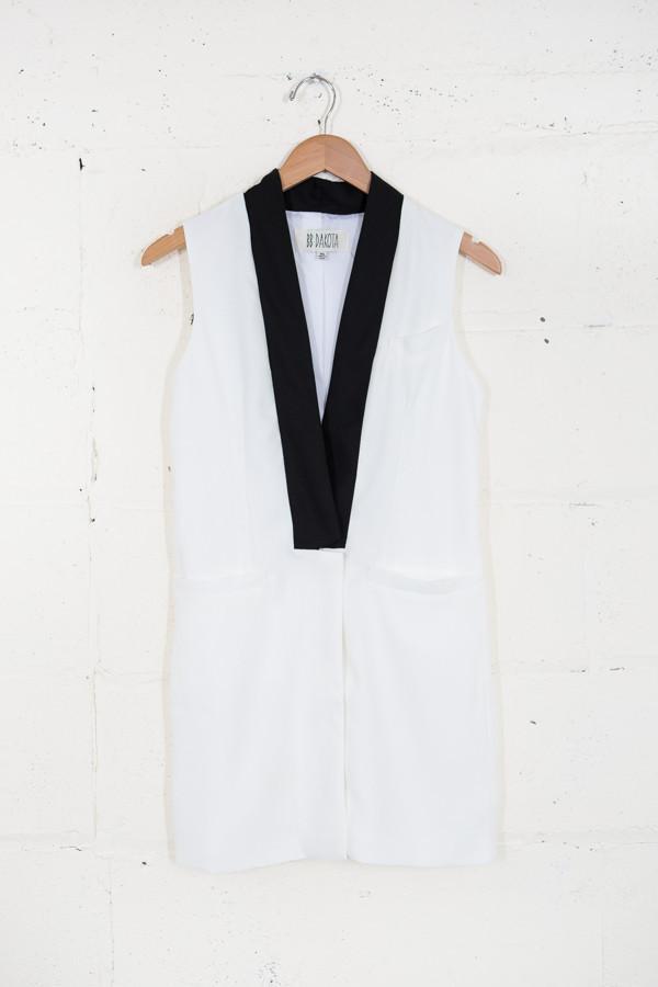 Tuxedo style longline vest with contrast lapels and two welt pockets at waist. Fully lined, hidden front button closure. 34” length. Looks great with a black bralette and sharp-toed pumps.