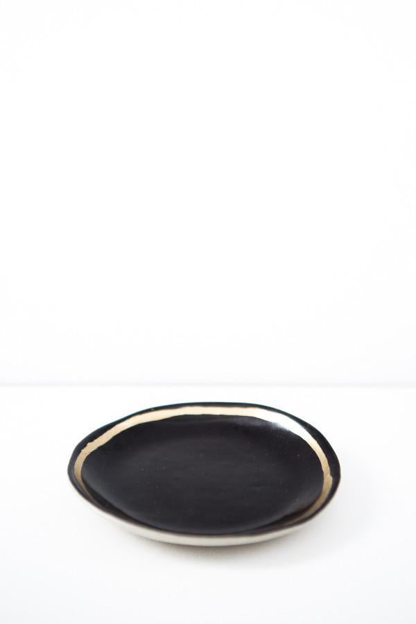 A porcelain ring dish finished in a black glaze and a simple golden ring around the rim. A pretty spot for your favorite jewelry.