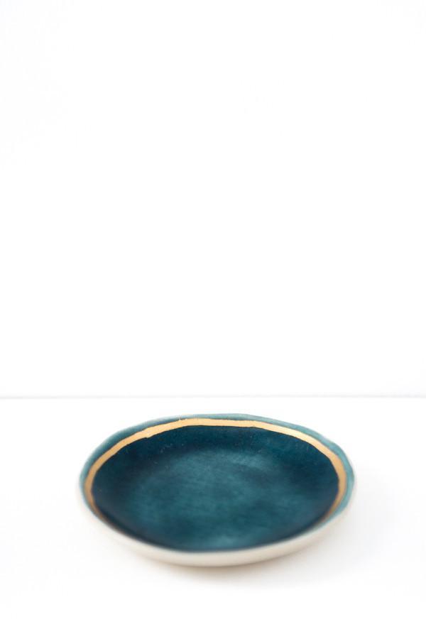 A porcelain ring dish finished in a glossy, midnight blue glaze and a simple golden ring around the rim. A pretty spot for your favorite jewelry.