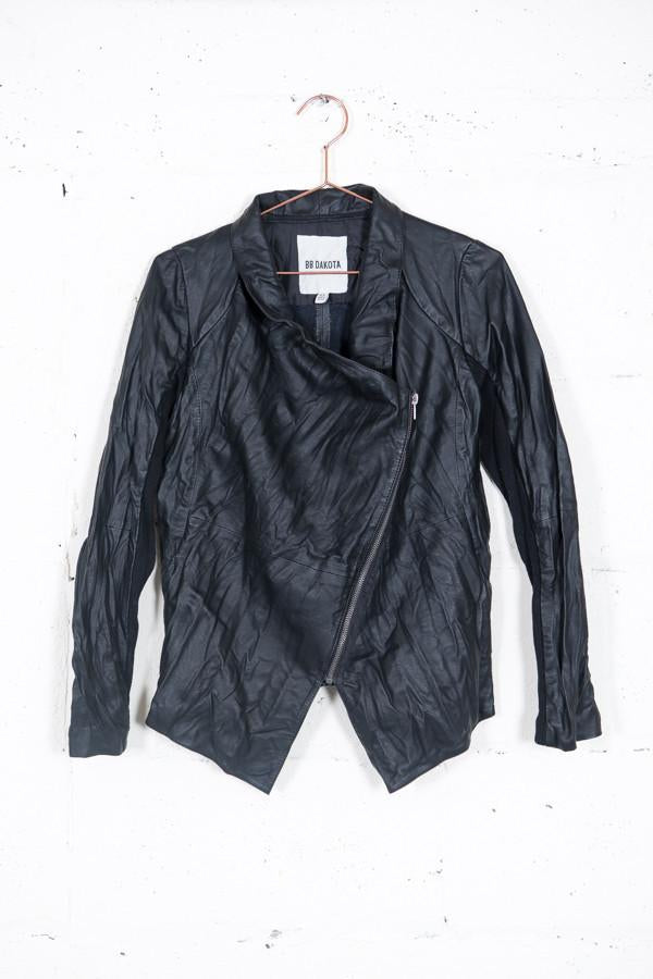 Wrinkle-textured vegan leather jacket with exposed asymmetrical zip front closure and rib knit sleeve detail. Fully lined. 26 ½” length