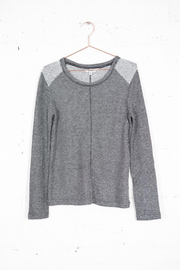 Soft french terry pullover with reverse fabric shoulders and contrast stitch detail.