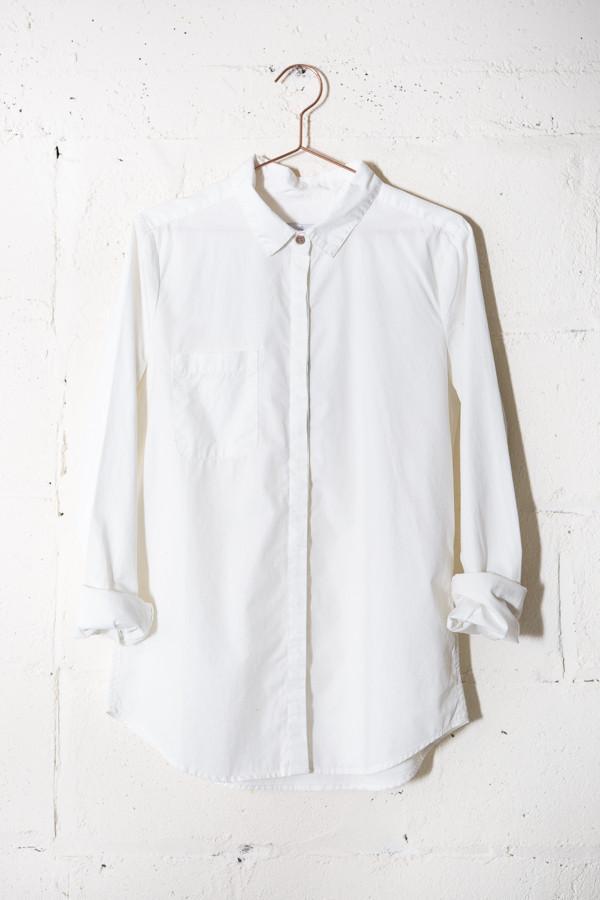 This 100% cotton poplin button-up features elegant front pocket, collar and cuff details.