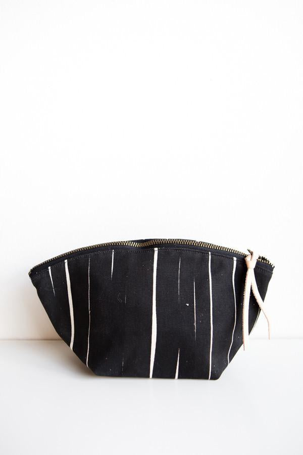 The essential pouch. Great for cosmetics or any small items that need organizing. Hand printed with our dynamic stripe print in black ink.    Details:  High quality brass zipper and vegetable tanned leather pull.  Size: 7" x 4" Fabric Content: Exterior is a high quality U.S. grown cotton canvas, cotton chambray interior, U.S. made zipper. Care: Hand wash and line dry. Designed, printed, and constructed in Portland, Oregon