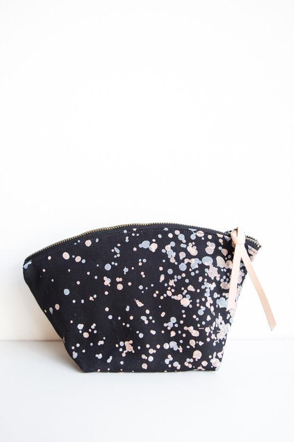 The essential pouch. Great for cosmetics or any small items that need organizing. Hand printed with our fresh and fun splatter print in apricot and light gray ink. Details: High quality brass zipper and vegetable tanned leather pull. Size: 7" x 4" Fabric Content: Exterior is a high quality U.S. grown cotton canvas, cotton chambray interior, U.S. made zipper. Care: Hand wash and line dry. Designed, printed, and constructed in Portland, Oregon.